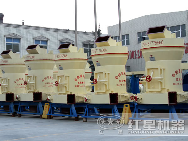 開始工作后,磨輥圍繞主軸旋轉(zhuǎn),并在高壓彈簧與離心力的作用下,緊貼磨環(huán)滾動,壓力比同等動力條件下的雷蒙磨粉機高1.2倍,所以產(chǎn)量大為提高。當被磨物 料進入磨腔后,由鏟刀鏟起送入磨輥與 磨環(huán)之間進行碾壓,碾壓后粉末隨鼓風機的循環(huán)風帶入分析機,合格細粉隨氣流入旋風集粉器即為成品,大顆粒物料落回重 磨。循環(huán)風返回鼓風機再重復以上過程,余風則進入袋式除塵器凈化。當磨輥 與磨環(huán)的磨損達到一定程度后,調(diào)整高壓彈簧長度,保持磨輥與環(huán)之間恒定碾壓力。從 而保證穩(wěn)定的產(chǎn)量。
