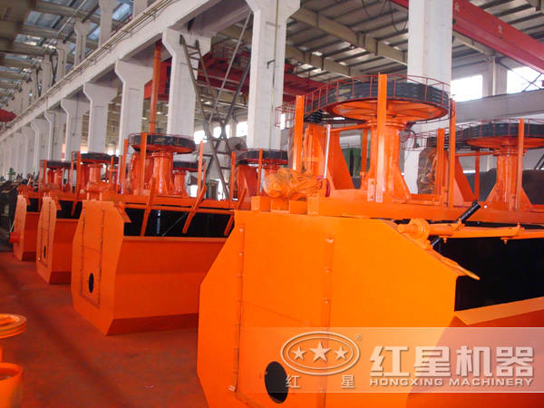3、細粒礦物被分離后進入攪拌筒和浮選藥劑進行充分、均勻的拌合,而后進入螢石礦選礦工藝的核心環(huán)節(jié)—浮選機中進行浮 選作業(yè),經(jīng)1次粗選、5次精選、2次掃選、通過控制礦漿濃度、酸堿度、加不同藥劑得到合格精礦。